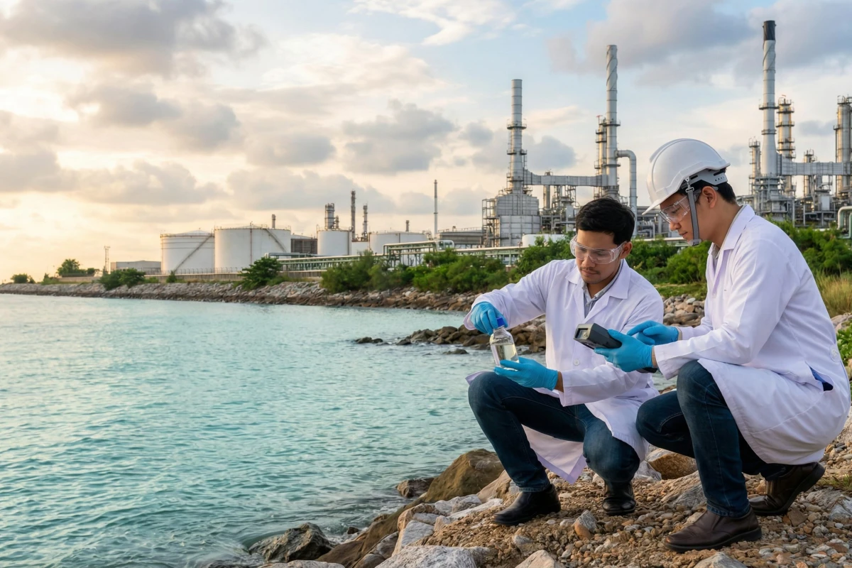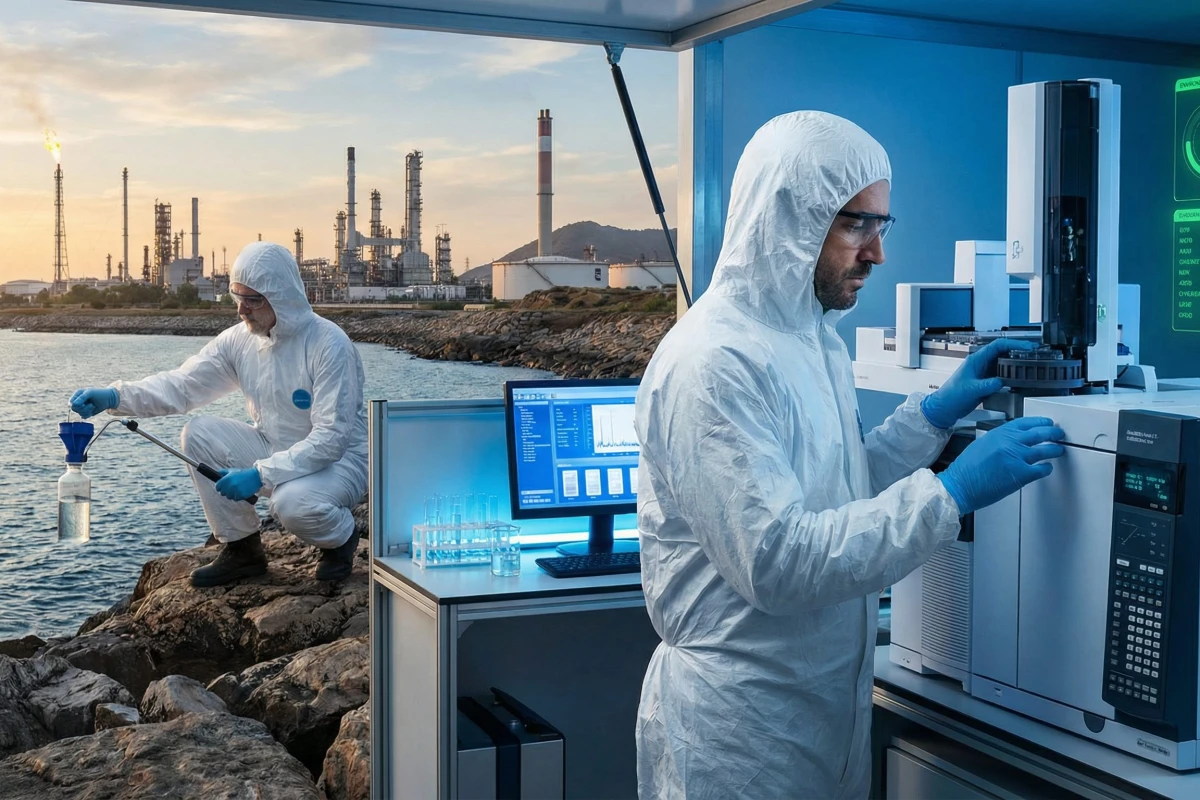 آب و پساب: انجام آزمایشهای شیمیایی و میکروبیولوژیکی و سنجش آلایندههای نوین مانند هیدروکربنهای نفتی (TPH)، ترکیبات آروماتیک (PAHs، BTEX) و فلزات سنگین.